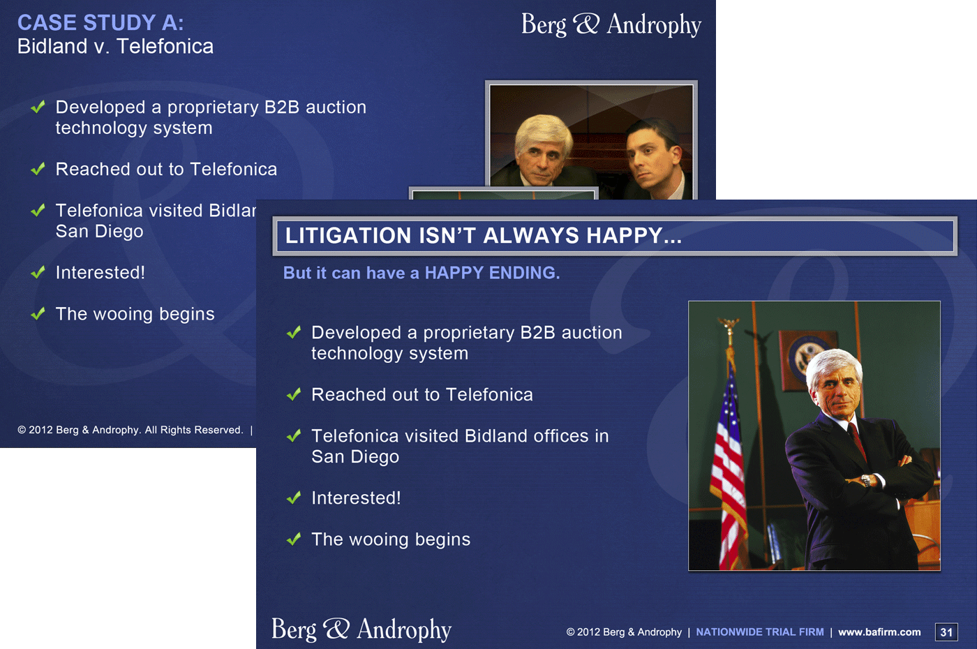 My role with Berg & Androphy included website design and development, keyword development, extensivecopywriting, and the design, development, and maintenance of at least four blogs. I also handled SEO keyword development and implementation, created custom graphics as needed, and developed multiple online ads and corresponding landing pages. Additionally, I designed custom PowerPoint presentations and presentation graphics, as well as print ads and custom PowerPoint templates. I also managed SEO for the client.