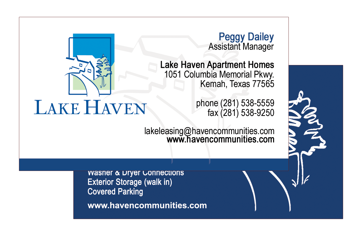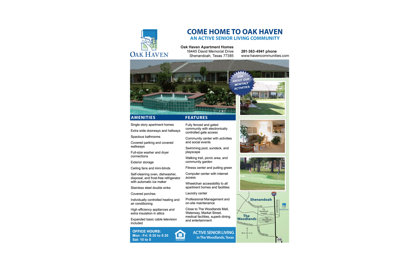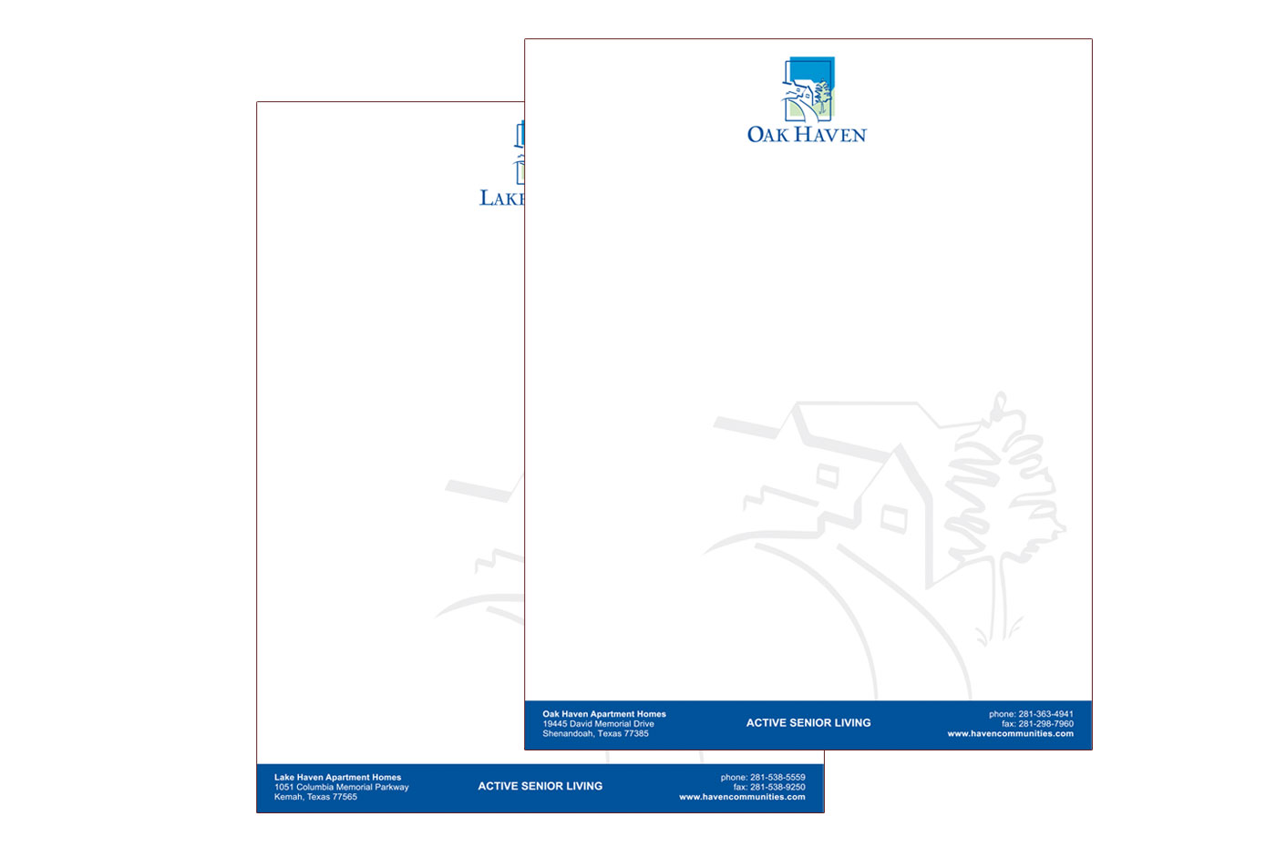 My role with this Haven included serving as the *Marketing Manager, overseeing market research, brand management, and the development of brand guidelines. I was responsible for creating logos for Haven Communities, Lake Haven, and Oak Haven, as well as copywriting, keyword development, and managing collateral for each brand. This included designing collateral materials such as brochures, postcards, and one-page brochures with hand-designed maps for Haven Communities and, Lake Haven. I also handled SEO management and website design and development. Additionally, I designed and managed print and web ads for both Lake Haven and Oak Haven, created signage, and provided photographic direction. I also developed a branded photo library and produced monthly newsletters for both Lake Haven and Oak Haven. Other tasks involved creating specialty graphics like floor plans and customized maps, door numbers, Office Hours signage, as well as promotional items such as bookmarks, branded water bottles, keyrings, foil stickers, t-shirts, polo shirts, and tablerunners for trade show booths. I also designed and managed sales tools, including presentation folders, door hangers, satisfaction surveys, market research, and referral forms for both brands. Additionally, I handled project management and oversaw the overall SEO strategy that was implemented by a 3rd party SEO firm.