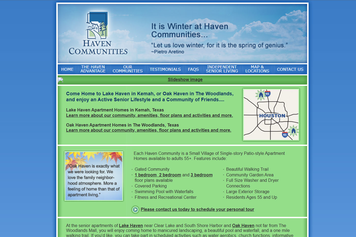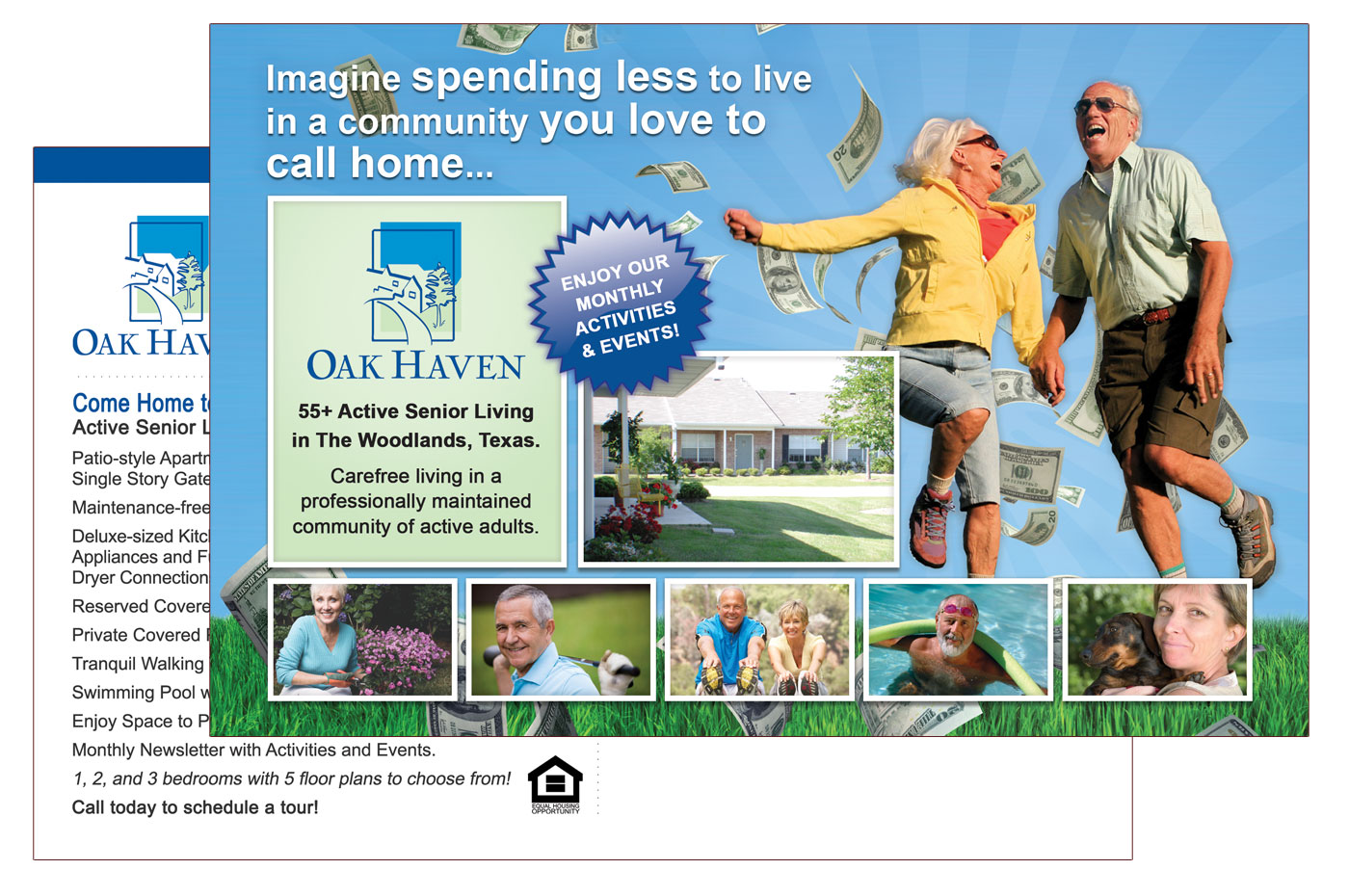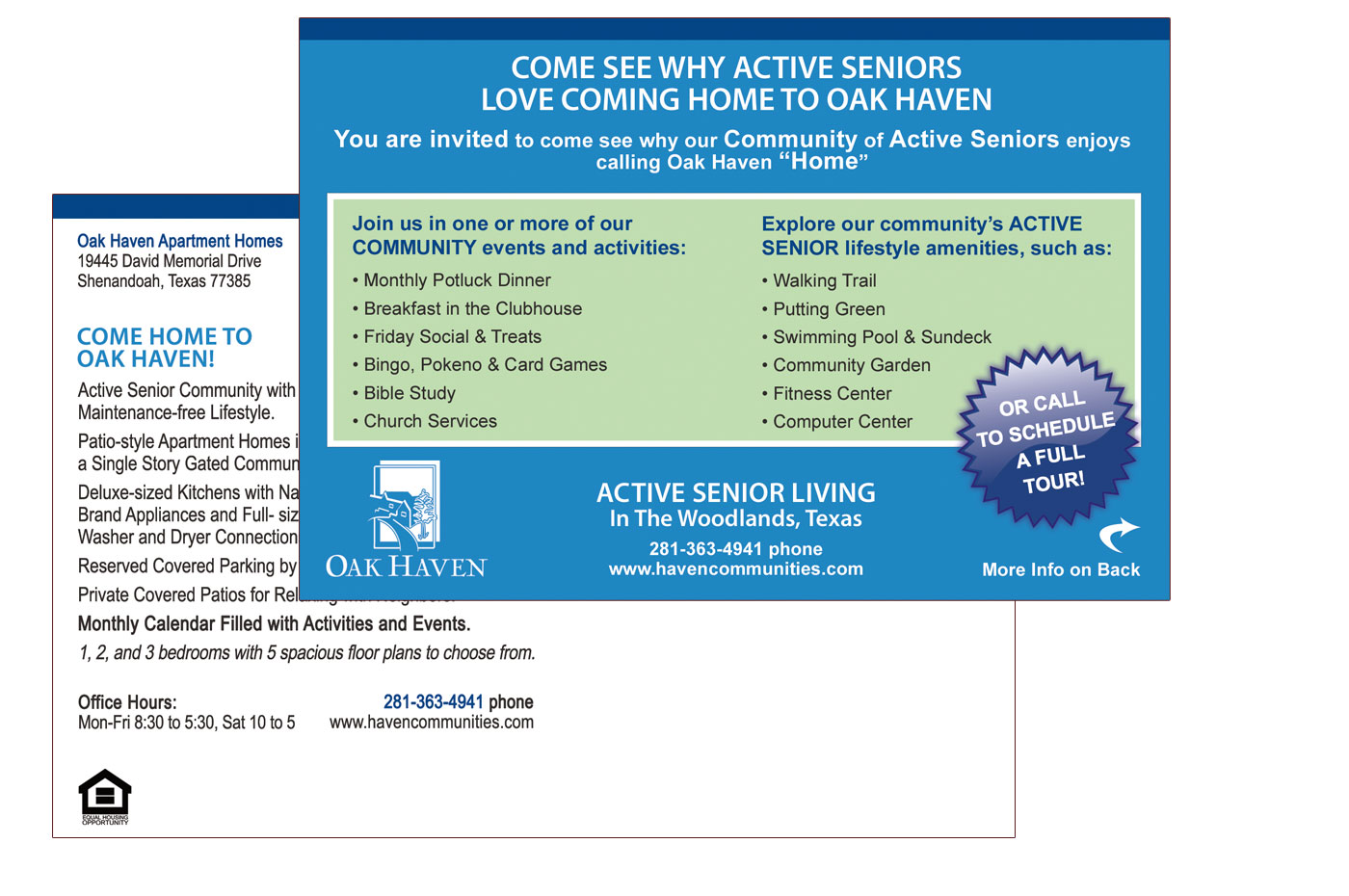 My role with this Haven included serving as the *Marketing Manager, overseeing market research, brand management, and the development of brand guidelines. I was responsible for creating logos for Haven Communities, Lake Haven, and Oak Haven, as well as copywriting, keyword development, and managing collateral for each brand. This included designing collateral materials such as brochures, postcards, and one-page brochures with hand-designed maps for Haven Communities and, Lake Haven. I also handled SEO management and website design and development. Additionally, I designed and managed print and web ads for both Lake Haven and Oak Haven, created signage, and provided photographic direction. I also developed a branded photo library and produced monthly newsletters for both Lake Haven and Oak Haven. Other tasks involved creating specialty graphics like floor plans and customized maps, door numbers, Office Hours signage, as well as promotional items such as bookmarks, branded water bottles, keyrings, foil stickers, t-shirts, polo shirts, and tablerunners for trade show booths. I also designed and managed sales tools, including presentation folders, door hangers, satisfaction surveys, market research, and referral forms for both brands. Additionally, I handled project management and oversaw the overall SEO strategy that was implemented by a 3rd party SEO firm.
