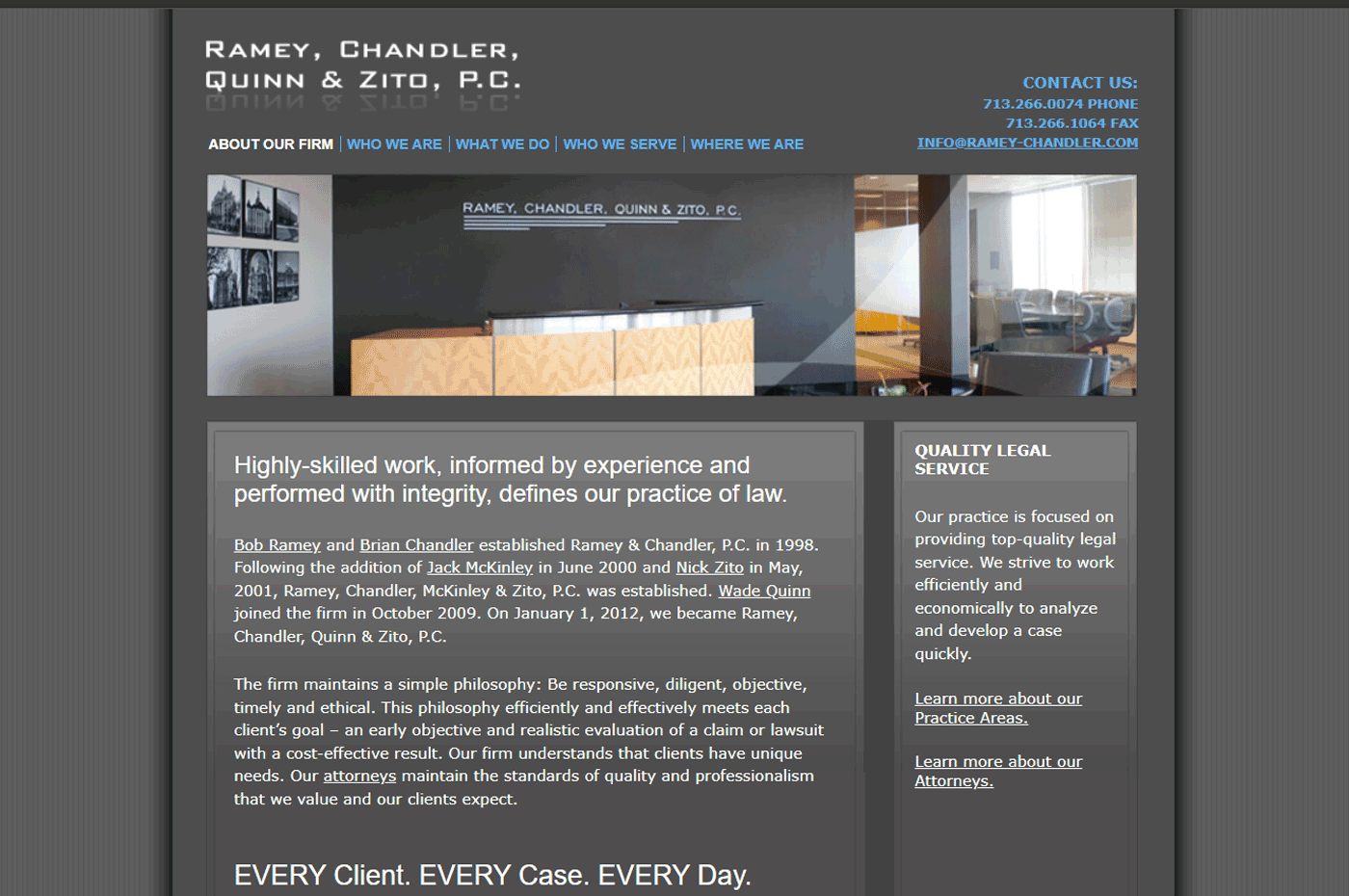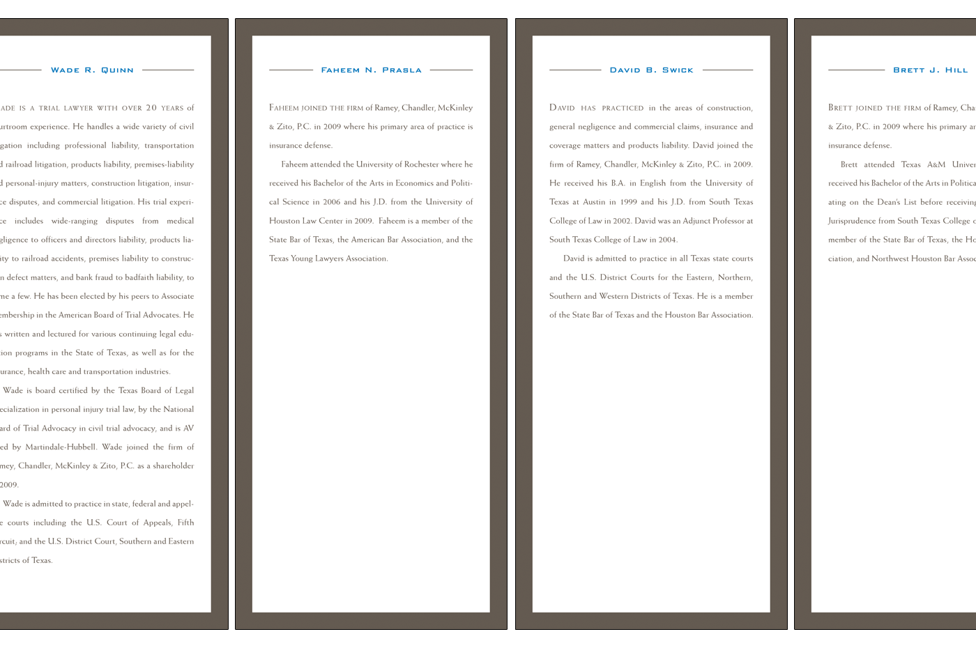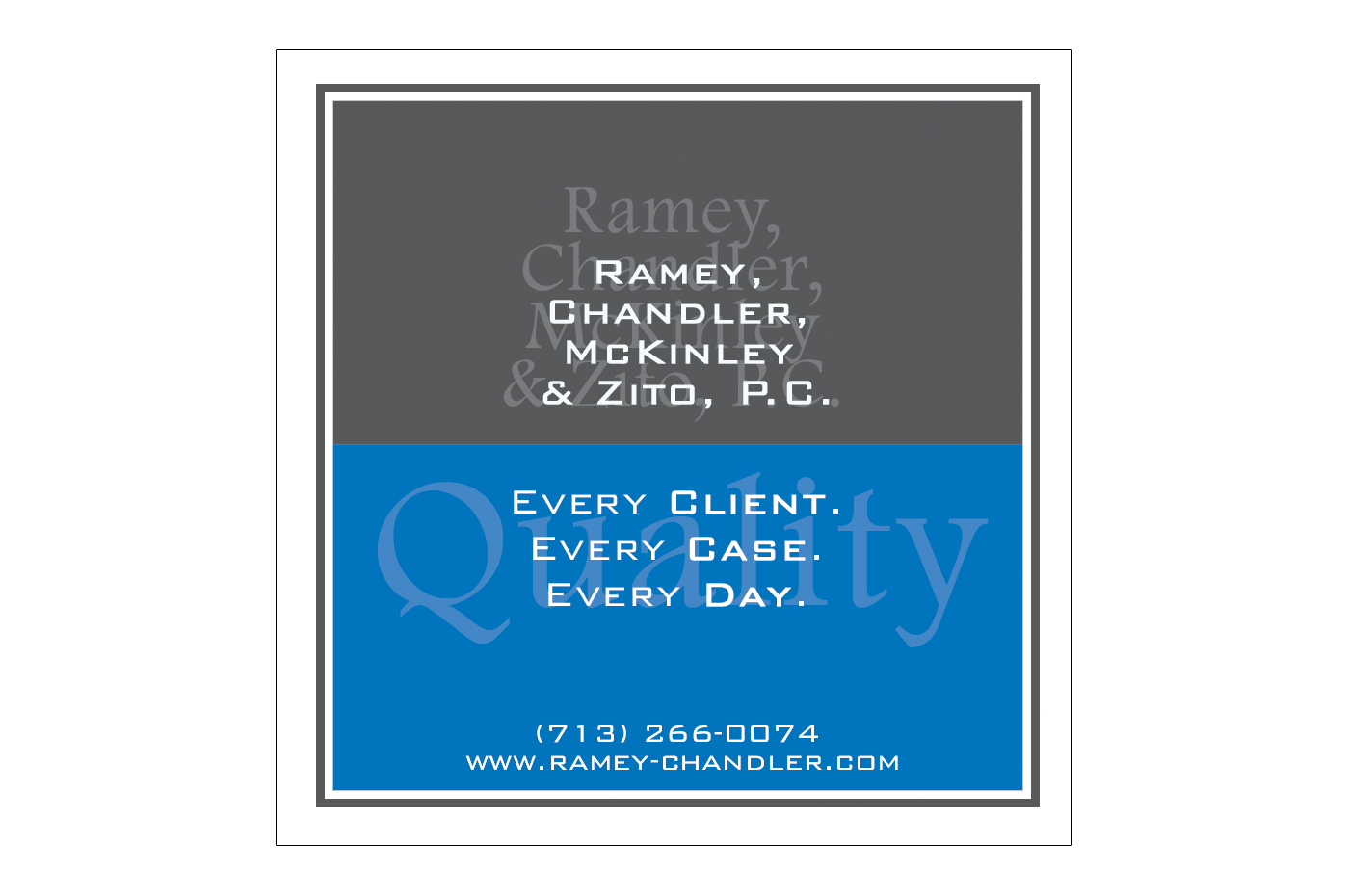 My role with this Ramey Chandler includes branding, logo design, copywriting, creating a custom screensaver, designing print ads, folder inserts with attorney biographies, developing the keyword list and branded phrases for the website, website design and designing promotional items such as water bottle labels.